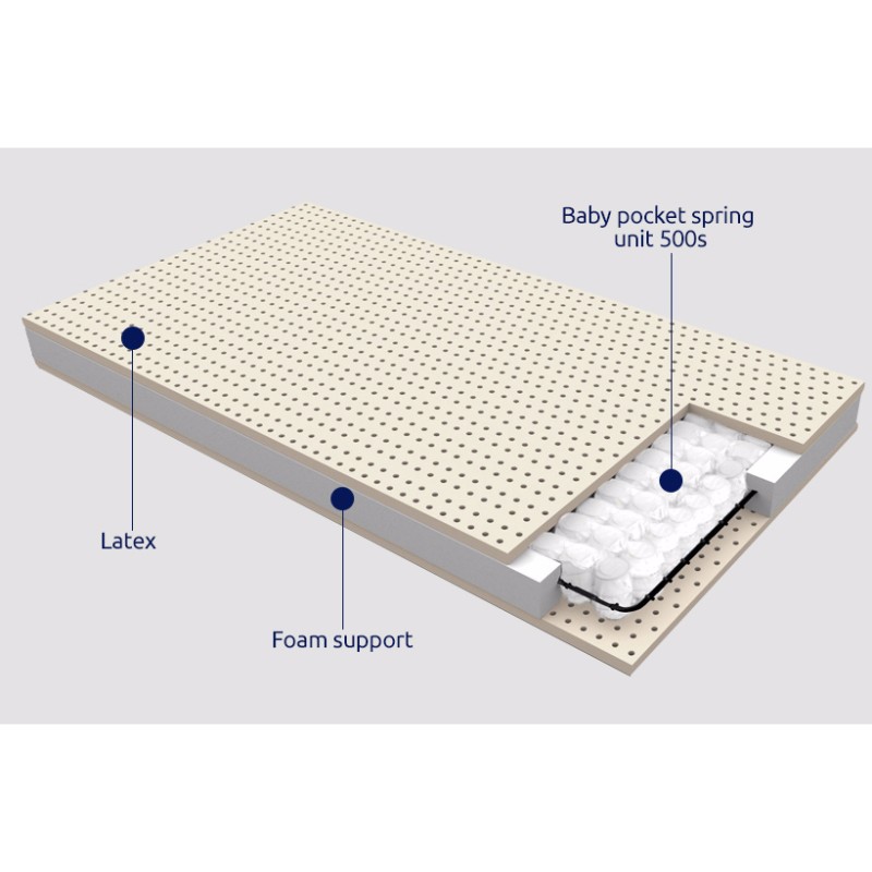 Η επιμέρους ελαστικότητα του κάθε ελατηρίου Baby pocket spring unit 500s συμβάλλει στη σωστή στήριξη της σπονδυλικής στήλης ενώ το αφρώδες υλικό Foam support υποστηρίζει περιμετρικά το στρώμα. Οι πολυάριθμες οπές του υποαλλεργικού Latex επιτρέπουν την κυκλοφορία του αέρα στο εσωτερικό του στρώματος και την απομάκρυνση της υγρασίας με αποτέλεσμα έναν άνετο και υγιεινό ύπνο για το μωρό σας!