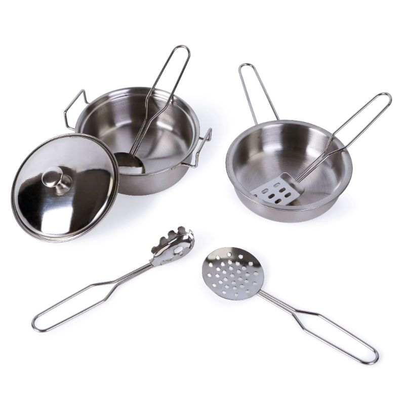 Ξύλινη κουζίνα με σκεύη, όπως κατσαρόλα, τηγάνι και σκεύη