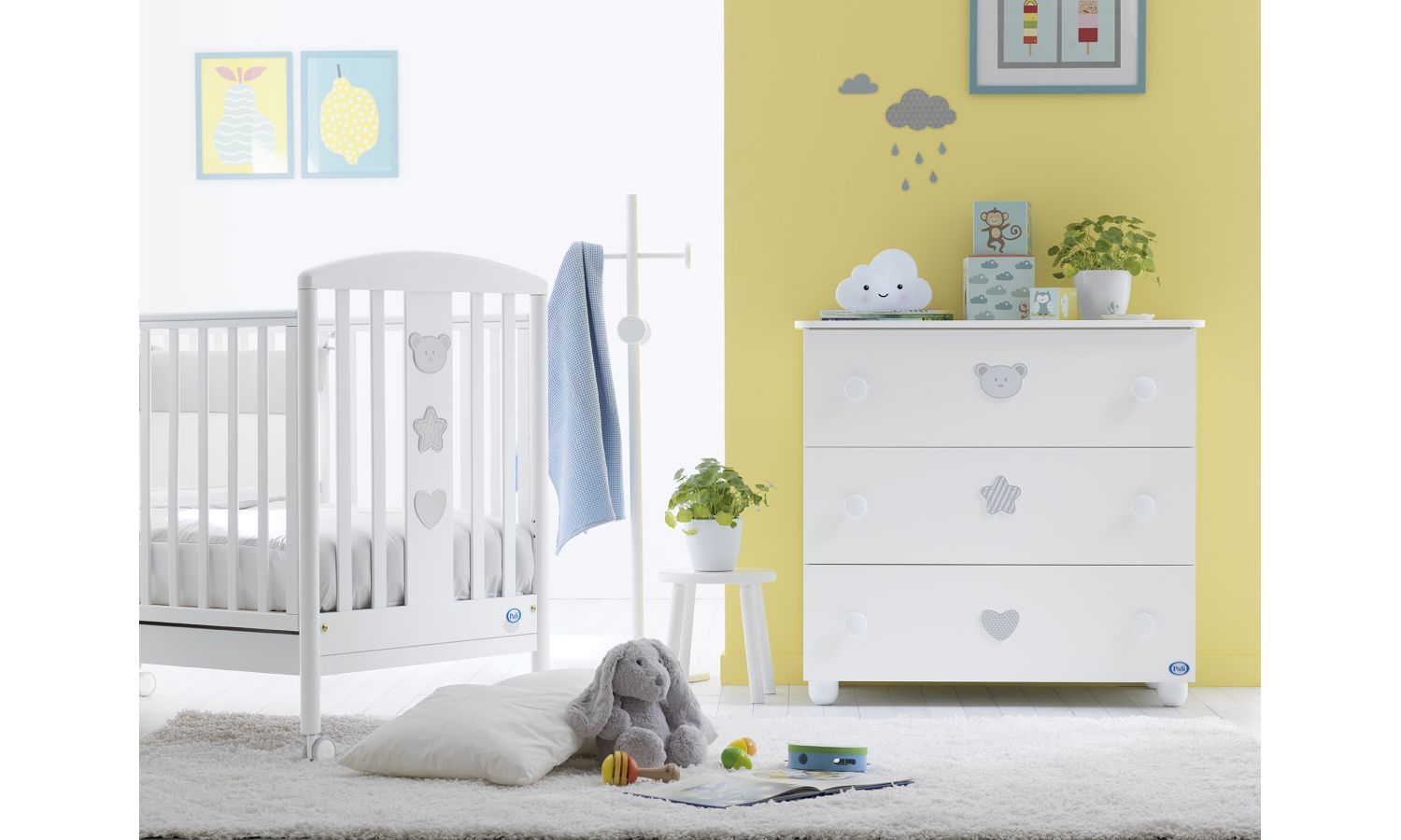 Λιτές γραμμές και μοντέρνα διάθεση σε λευκό χρώμα με διακριτικό σχέδιο από τη σειρά βρεφικών επίπλων Birillo της Pali.