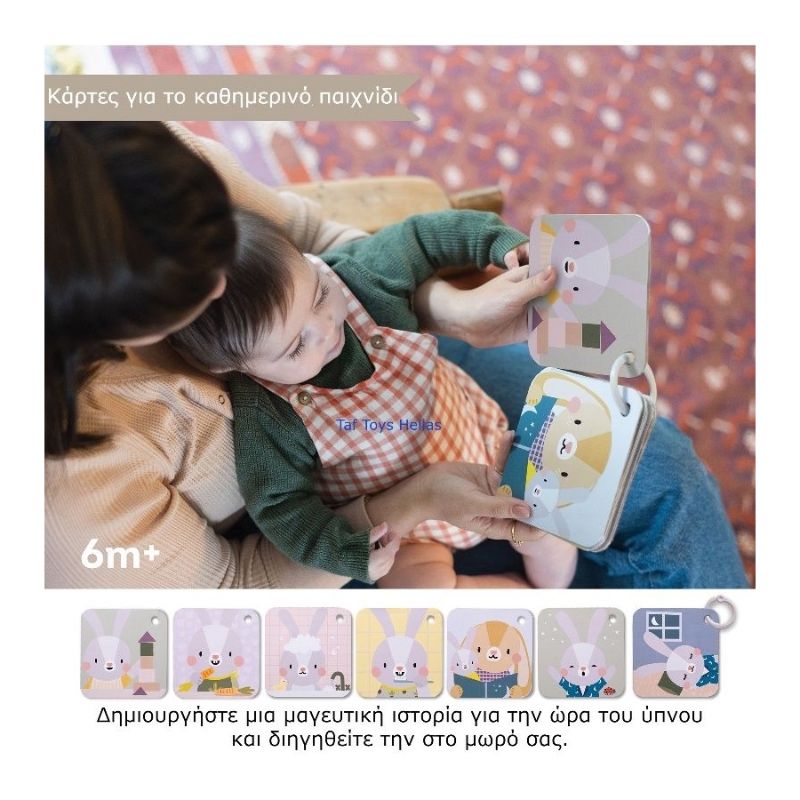 Δίνει οπτική διέγερση με κάρτες εικόνων ρουτίνας πριν τον ύπνο, βοηθώντας στη